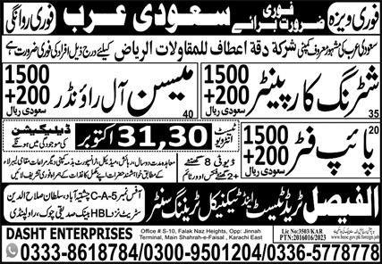 Latest Construction jobs and others Overseas jobs in Al Faisal Trade Test & Technical Training Center closing date is around October 31, 2023, see exact from ad. Read complete ad online to know how to apply on latest Al Faisal Trade Test & Technical Training Center job opportunities. Some jobs in Al Faisal Trade Test & Technical Training Center may require skills like Masonry, Piping and Carpentry. Salary varies from 130000. Earn more by overtime. Employer provides medical, transport and accommodation facility.
