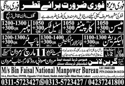 Vacant posts including mason, pipe fitter, plumber, steel fixer, electrician, carpenter and fire alarm technician are announced in Bin Faisal National Manpower Bureau Doha, doha Qatar as per 9 March 2024 advertisement in daily Express Newspaper. Preferred Education is Middle, DAE, Matric and Intermediate etc.