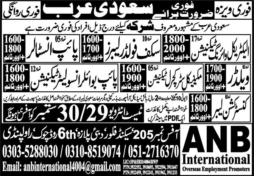 ANB International Overseas Employment Promoters invites applications for job positions advertised in daily Express dated 27 September 2025 for following vacancies in Riyadh, dammam Saudi Arabia.