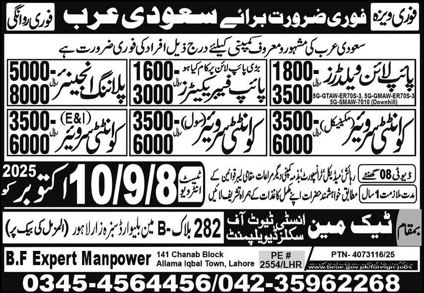 BF Expert Manpower jobs advertisement dated about 5 October 2025 in daily Express Newspaper invites application for the vacant post of planning engineer, pipe fabricator, quantity surveyor and pipe line welder in Riyadh, riyadh Saudi Arabia. Educational qualifications required Middle and Bachelor etc.