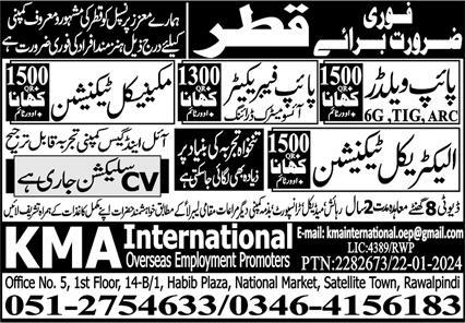 KMA International Overseas Employment Qatar, qatar Qatar invites applications from eligible candidates for the post of pipe welder, electrical technician, mechanical technician and pipe fabricator as per advertisement of February 14, 2024 published in daily Express Newspaper. Educational qualifications required Matric, Middle and Intermediate etc.