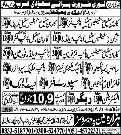 Hazara Manpower Services jobs advertisement dated about 8 June 2024 in daily Express Newspaper invites application for the vacant post of Carbon Steel Pipe Welder, Welder, Pipe Welder Foreman, Fire Alarm Technician, Surveillance Camera Technician, Stainless Steel Pipe Fitter, Carbon Steel Grinder, Rigger, Labor, Carbon Steel Pipe Fitter, Stainless Steel Grinder, Piping Mechanical Engineer, Electrician, Argon Stainless Steel Pipe Welder, Pipe Welder, Carbon Steel Foreman, Stainless Steel Pipe Fitter Foreman, Pipe Mechanic Supervisor, Support Fitter and It Network Technician in Makkah, riyadh Saudi Arabia. Preferred Education is B.E, Matric, DAE, Intermediate and Bachelor etc.