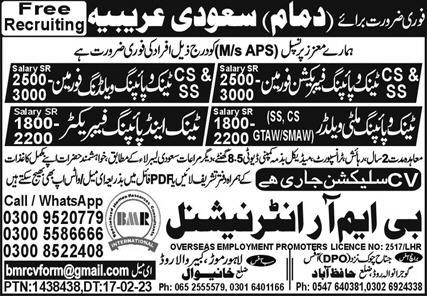 BMR International Jeddah, dammam Saudi Arabia invites applications from eligible candidates for the post of piping welding foreman, multi welder, piping fabricator, tank fabricator, piping fabrication foreman, tank welding foreman, tank fabrication foreman, piping multi welder and tank multi welder as per advertisement of February 18, 2023 published in daily Express Newspaper. Candidates with Matric, Intermediate and Bachelor etc. educational background will be preferred.