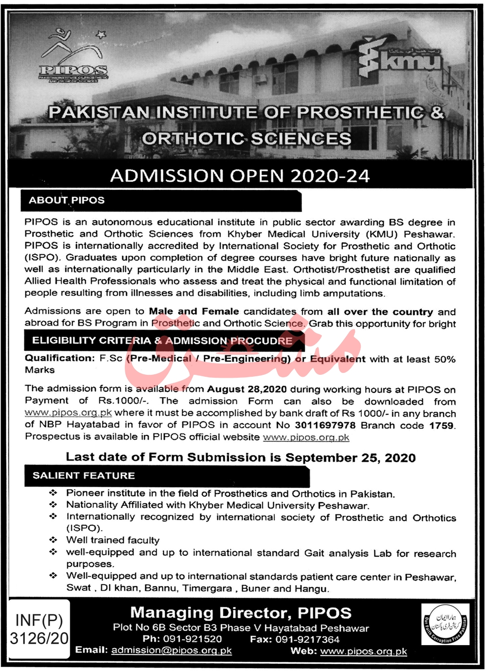 Pakistan Institute of Prosthetic & Orthotic Sciences PIPOS is an autonomous educational institute in public sector awarding BS degree in Prosthetic and Orthotic Sciences in Peshawar KPK. Read newspaper ad for exact details.