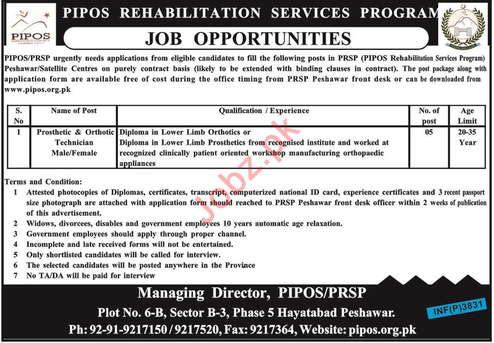 Latest PIPOS Rehabilitation Services Programs Management Posts Peshawar 2025