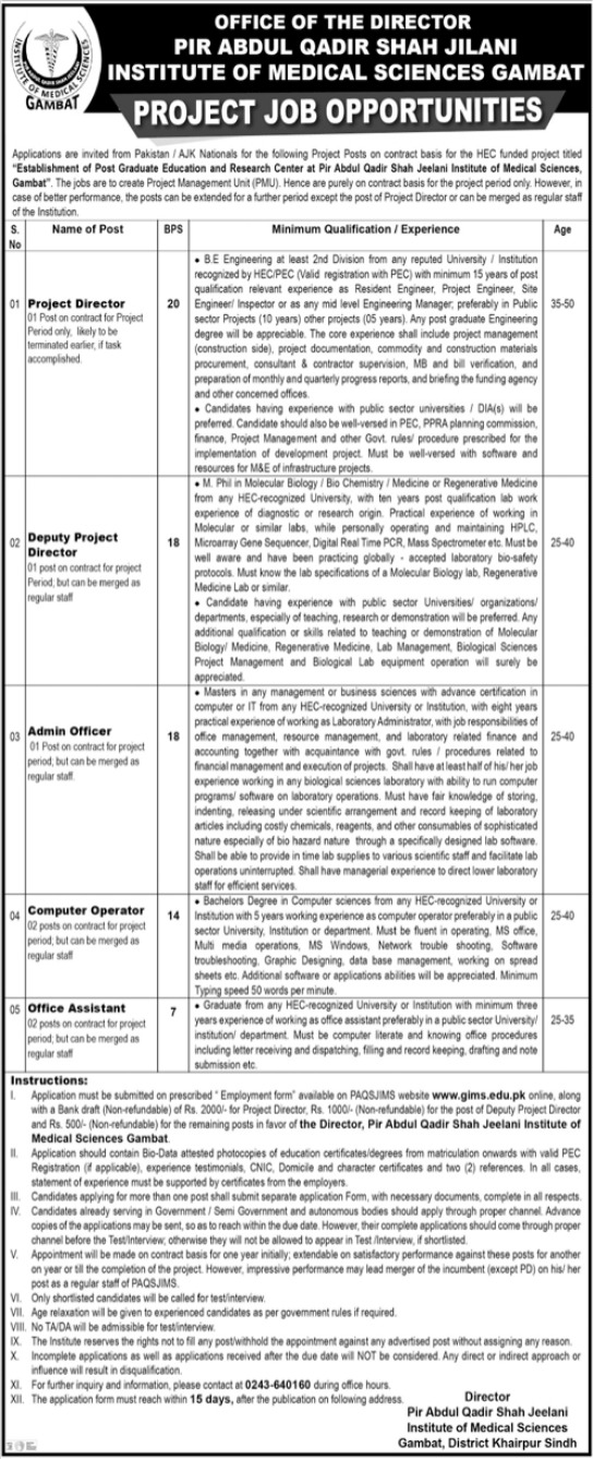 Latest Pir Abdul Qadir Shah Jeelani Institute of Medical Sciences Education Posts Khairpur 2025