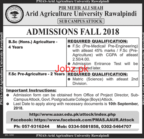 Pir Mehr Ali Shah Arid Agriculture University Rawalpindi Admission in BSc Honor Agriculture and Fsc Pre Agriculture 2 year Program in Sub Campus Attock. Read newspaper ad for exact details.