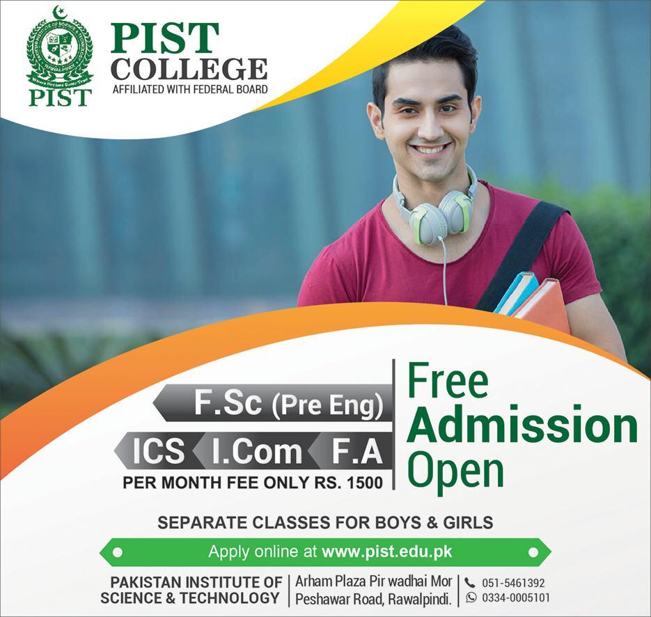 Pakistan Institute of Science & Technology PIST announces the admissions in FSC Pre Engineering, ICS, ICOm, FA in Rawalpindi. Separate classes for boys and girls. College is affiliated with Federal Board Islamabad. Read newspaper ad for exact details.