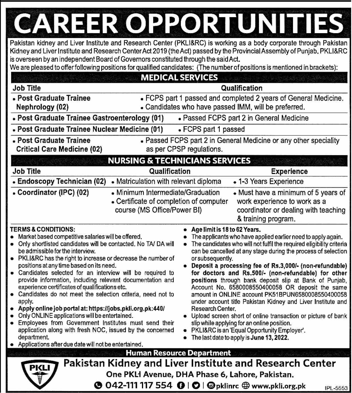 Pakistan Kidney And Liver Institute And Research Centre PKLI latest Government Education jobs and others can be applied till June 13, 2022 or as per closing date in newspaper ad. Read complete ad online to know how to apply on latest Pakistan Kidney And Liver Institute And Research Centre PKLI job opportunities.