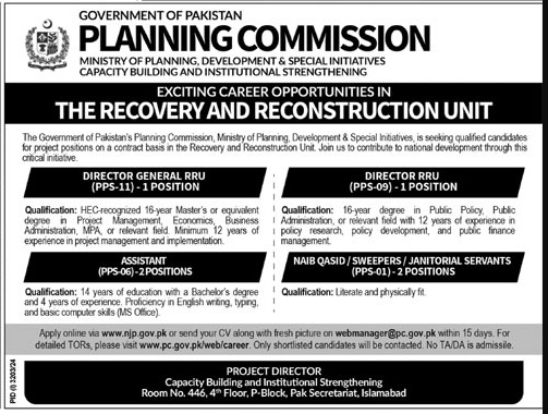 Planning Commission jobs advertisement dated about 10 November 2024 in daily Ausaf Newspaper invites application for the vacant post of director general rru, naib qasid, director rru, assistant and janitorial servant in Islamabad, islamabad Islamabad Pakistan. Preferred Education is Master, Bachelor and Intermediate etc.