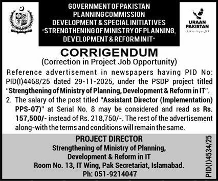 Vacancies in Ministry of Planning Development and Special Initiative Advertisement December 2025