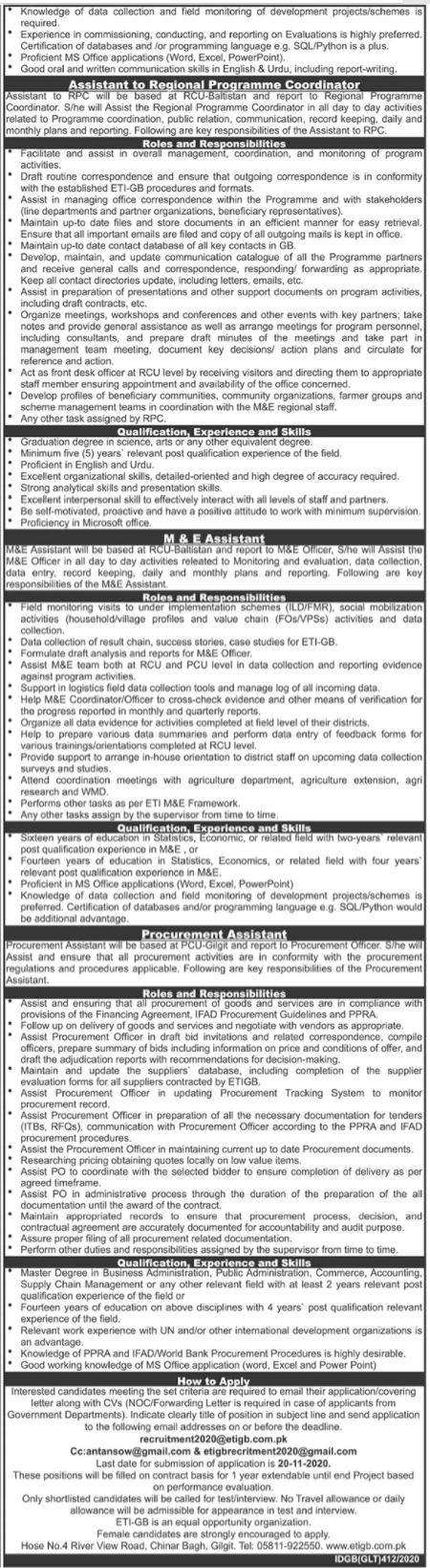 Planning & Development Department Government of Gilgit Baltistan Economic Transformation Initiative Gilgit Baltistan ETIGB invites applications from highly qualified and experienced individuals for the posts of Regional Programme Coordinator, Social Mobilization Coordinator, Monitoring Officer, Evaluation Assistant, Assistant and Procurement Assistant.