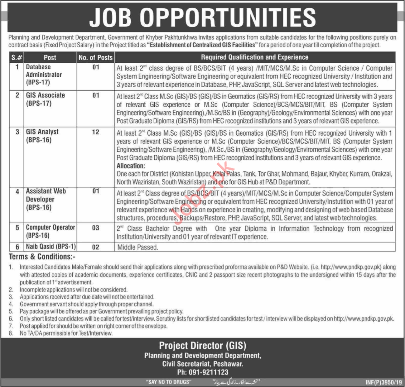 Planning and Development Department Government of Khyber Pakhtunkhwa invites applications from highly qualified and well educated individuals for the positions of Database Administrator, GIS Associate, GIS Analyst, Assistant Web Developer, Computer Operator and Naib Qasid in Peshawar KPK 2019.