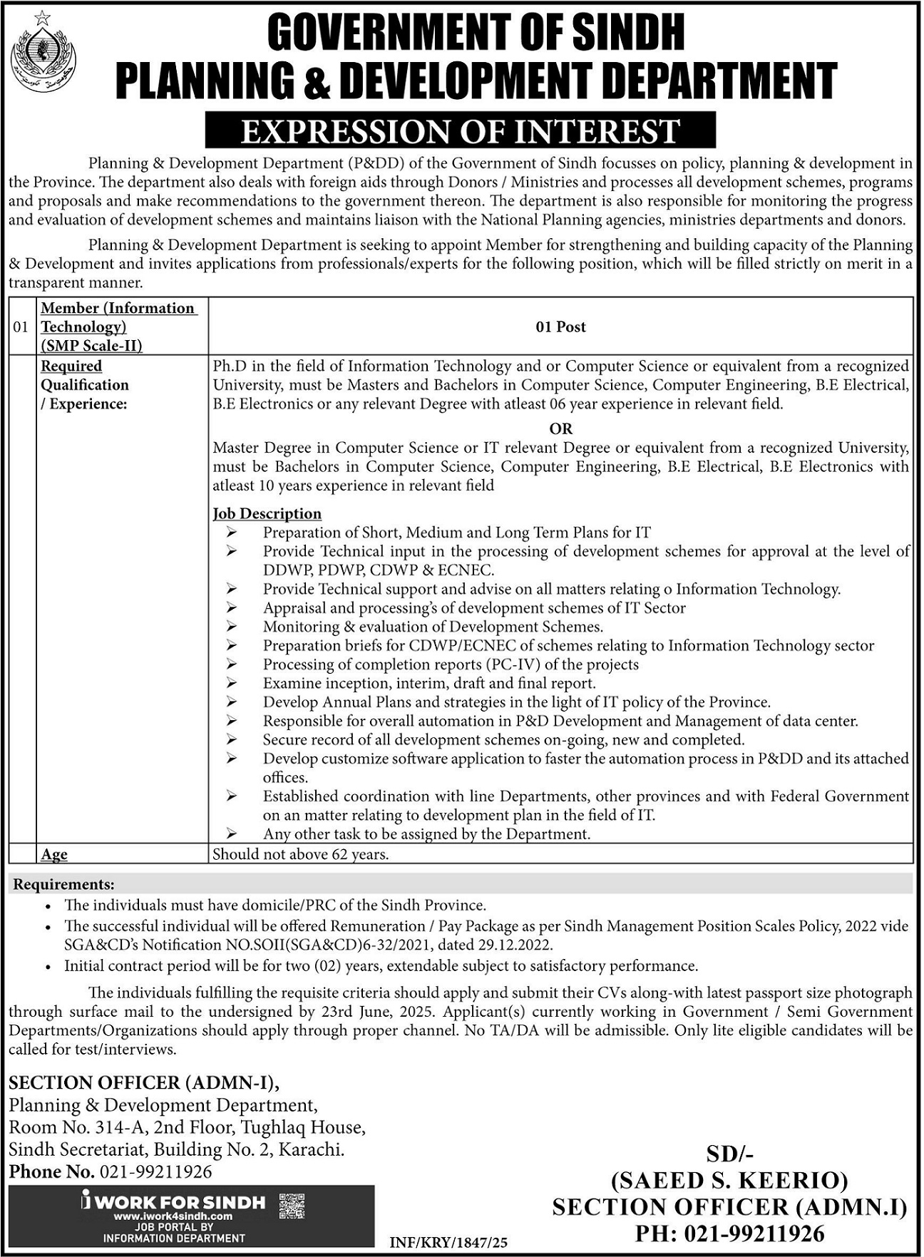 Planning & Development Department jobs advertisement dated about 2 June 2025 in daily Express Tribune Newspaper invites application for the vacant post of member in Karachi, karachi Sindh Pakistan. Bachelor, Mphil, Master and Phd etc. educational qualification will be preferred.