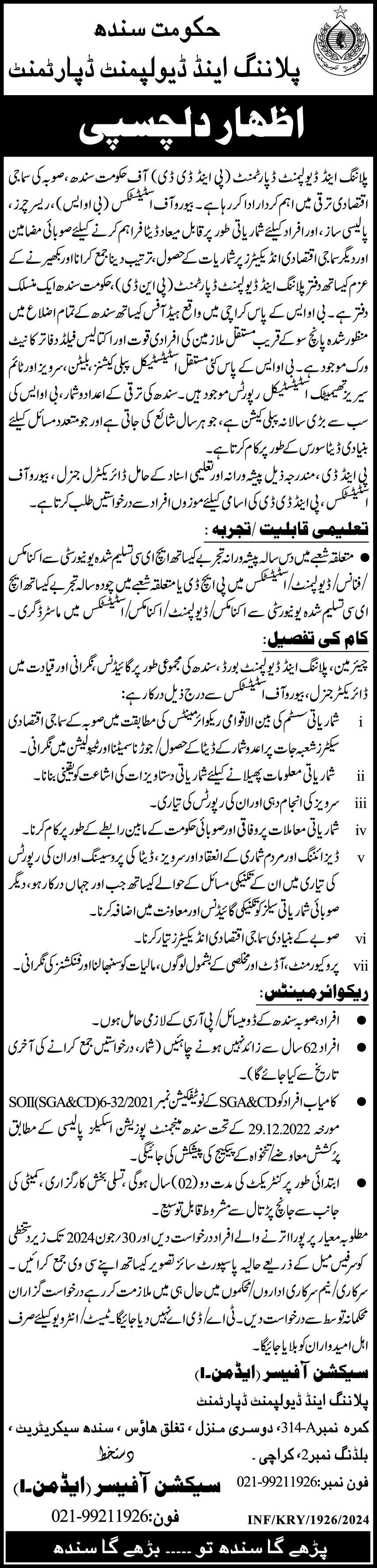 Planning and Development Department invites applications for job positions advertised in daily Express dated 13 June 2024 for following vacancies in Karachi, karachi Sindh Pakistan.