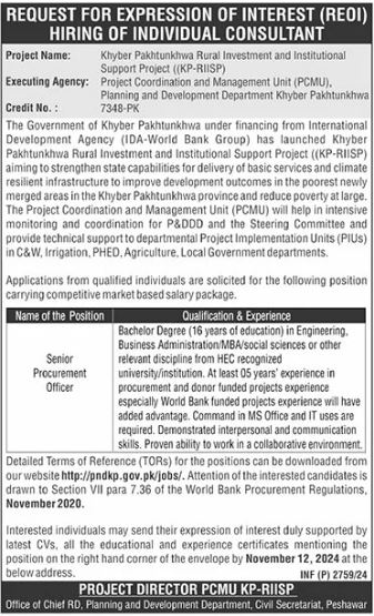 Planning and Development Department Peshawar, peshawar Khyber Pakhtunkhwa KPK Pakistan invites applications from eligible candidates for the post of procurement officer as per advertisement of October 24, 2024 published in daily The News Newspaper. Preferred Education is MBA, B.E, Bachelor and BBA etc.