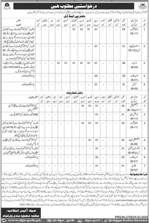Vacant posts including Driver, Farash, Daftri, Assistant Computer Operator, Statistical Assistant, Photostat Machine Operator, Draftsman, Clerk, Naib Qasid, Htv Driver and Statistical Computer are announced in Planning & Development Department Quetta, quetta Balochistan Pakistan as per 25 March 2025 advertisement in daily Jang Newspaper. Educational qualifications required Intermediate, Matric and Middle etc.