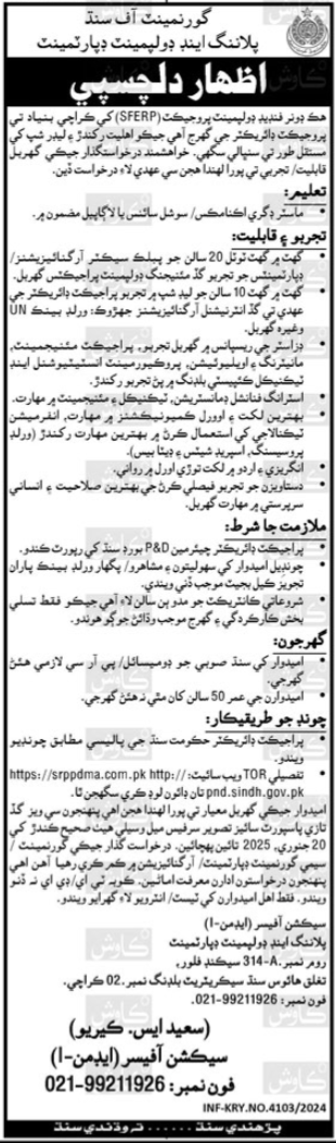 Planning and Development Department Karachi, karachi Sindh Pakistan invites applications from eligible candidates for the post of project director as per advertisement of December 27, 2024 published in daily Kawish Newspaper. Educational qualifications required MA, Master and M.sc etc.