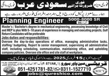 Apply at Qureshi Manpower Bureau latest Overseas jobs in Engineering and departments before closing date which is around February 20, 2025 or as per closing date in newspaper ad. Read complete ad online to know how to apply on latest Qureshi Manpower Bureau job opportunities. Overtime might be allowed. Free accommodation, medical and transport may be available.