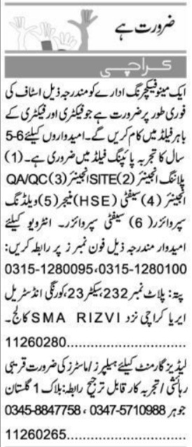 Engineering Company jobs advertisement dated about 13 June 2023 in daily Express Newspaper invites application for the vacant post of site engineer, tailor master, safety supervisor, helper, planning engineer, welding supervisor, engineer, hse manager, safety manager, qa engineer and qc engineer in Karachi, karachi Sindh Pakistan. Preferred Education is Matric, Bachelor, DAE, Intermediate, B.E and Middle etc.