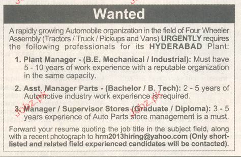 Plant Manager, Assistant Manager Parts Job Opportunity