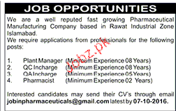 Plant Manager, QC Incharge and Pharmacists Job Opportunity