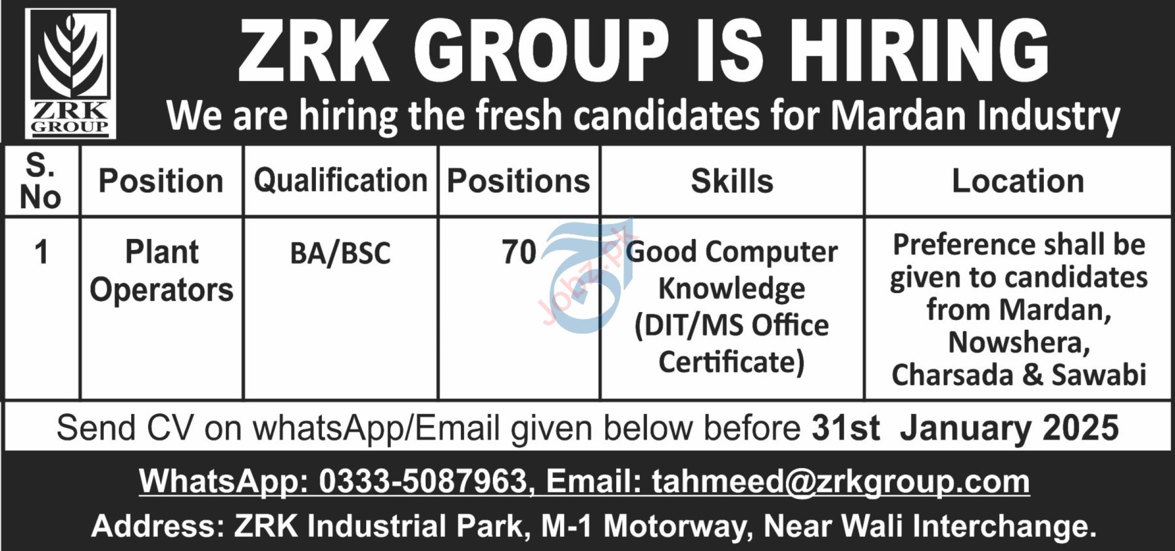ZRK Group of Companies Mardan, mardan Khyber Pakhtunkhwa KPK Pakistan invites applications from eligible candidates for the post of plant operator as per advertisement of January 19, 2025 published in daily Aaj Newspaper. Preferred Education is BA and Bachelor etc.
