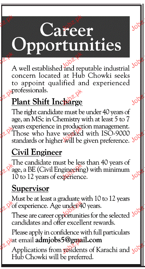 Plant Shift Incharge, Civil Engineers Job Opportunity