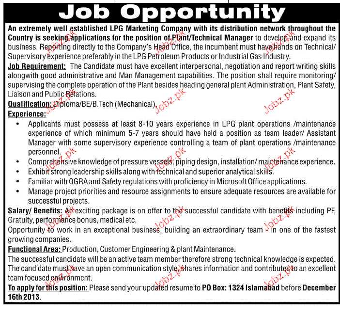 Apply as per details in job advertisement. Login to view further details of how to apply via https://www.jobz.pk online.