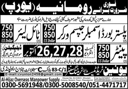 Al Hijaz Overseas Manpower Supply jobs advertisement dated about 22 October 2023 in daily Express Newspaper invites application for the vacant post of tile layer, plaster board assembly gypsum worker and painter in Romania, romania Romania. Middle and Matric etc. educational qualification will be preferred.