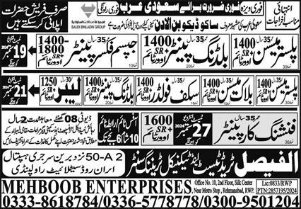 Mehboob Enterprises Overseas Employment Promoters jobs advertisement dated about 20 September 2024 in daily Express Newspaper invites application for the vacant post of block mason, gypsum fixer painter, building painter, scaffolder, plaster mason and labor in Riyadh, riyadh Saudi Arabia. Educational qualifications required Middle etc.