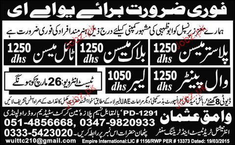 Plaster Mason, Blcok Mason and Tile Fixers Job Opportunity