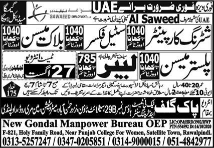 New Gondal Manpower Bureau Sharjah, abu dhabi UAE invites applications from eligible candidates for the post of block mason, labor, steel fixer, shuttering carpenter and plaster mason as per advertisement of August 20, 2022 published in daily Express Newspaper. Preferred Education is Matric and Middle etc.