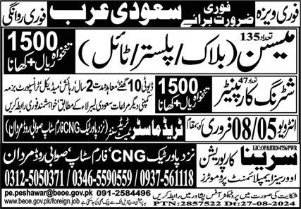 Trade Master Trade Test Center jobs advertisement dated about 5 February 2025 in daily Express Newspaper invites application for the vacant post of block mason, shuttering carpenter, tile mason, mason and plaster mason in Riyadh, madina Saudi Arabia. Matric and Middle etc. educational qualification will be preferred.