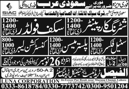Apply at Al Faisal Trade Test & Technical Training Center latest Overseas jobs in Construction and departments before closing date which is around November 26, 2025 or as per closing date in newspaper ad. Read complete ad online to know how to apply on latest Al Faisal Trade Test & Technical Training Center job opportunities. Salary varies from 104000.