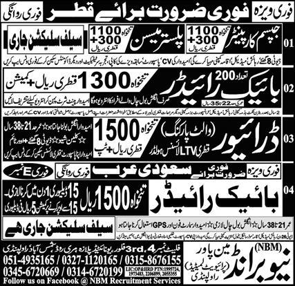 New Brand Manpower jobs advertisement dated about 12 January 2024 in daily Express Newspaper invites application for the vacant post of rider, valet parking driver, bike rider, gypsum carpenter, plaster mason, driver and mason in Qatar, qatar Qatar. Candidates with Middle, Matric and Intermediate etc. educational background will be preferred.