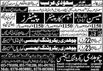 Chaudhary Recruiting Agency invites applications for job positions advertised in daily Express dated 15 April 2025 for following vacancies in Dammam, tabuk Saudi Arabia.