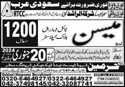 Harmain Trade Test & Technical Training Center latest Overseas Construction jobs and others can be applied till 20 January 2024 or as per closing date in newspaper ad. Read complete ad online to know how to apply on latest Harmain Trade Test & Technical Training Center job opportunities. Learn today extra skills including Masonry and Tiling to get these Harmain Trade Test & Technical Training Center jobs. Salary varies from 91000. Overtime is allowed. Employer provides transport, accommodation and medical facility.