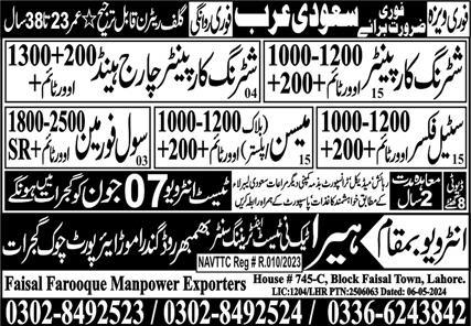 Vacant posts including civil foreman, block mason, mason, shuttering carpenter chargehand, plaster mason, steel fixer and shuttering carpenter are announced in Heera Tech Ni Test & Training Center Riyadh, jeddah Saudi Arabia as per 4 June 2024 advertisement in daily Express Newspaper. Intermediate, Bachelor and Matric etc. educational qualification will be preferred.