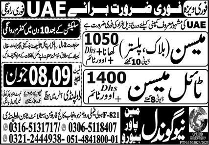 Vacant posts including tile mason, block mason, plaster mason and mason are announced in New Gondal Manpower Bureau Sharjah, abu dhabi UAE as per 7 June 2023 advertisement in daily Express Newspaper. Intermediate and Matric etc. educational qualification will be preferred.
