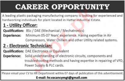 Plastic Manufacturing Company Limited is looking for candidates for following posts as per job advertisement published in daily Jang Newspaper of October 15, 2023 for location Hattar, hattar Khyber Pakhtunkhwa KPK Pakistan: