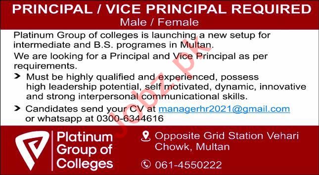 Platinum Group Of Colleges Jobs Principal & Vice Principal