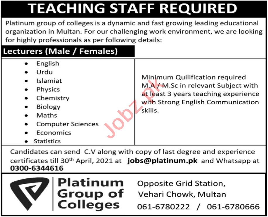 Platinum Group of Colleges Multan, Pakistan is seeking candidates for the posts of Lecturer, Female Lecturer, Lecturer English, Lecturer Urdu, Lecturer Islamiat, Lecturer Physics, Lecturer Chemistry, Lecturer Biology, Lecturer Maths, Lecturer Computer Sciences, Lecturer Economics, Lecturer Statistics.