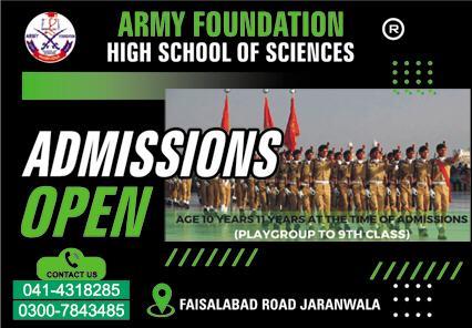 Army Foundation High School of Sciences has announced admissions 2022 for Play Group to 9th Class. Eligible students can apply for academic admissions 2022 in Army Foundation High School of Sciences Jaranwala Punjab Pakistan for Science School. Students who want to enroll for academic session 2022 in Middle, Primary and Matric qualification and admission criteria for Private institute can apply till last date 11 January 2023. Read newspaper ad for exact details.