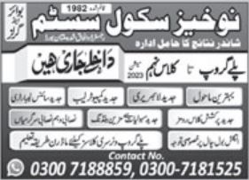 Noukhez School System Play Group to 9th Class admissions 2022 has been announced. Students who want to take admissions in Noukhez School System Multan Punjab Pakistan for academic year 2022 to continue education in Science School can apply. Eligible candidates for admissions in Matric, Middle and Primary can apply as per Private institute criteria and before closing date 25 January 2023 after reading advertisement online. Read newspaper ad for exact details.