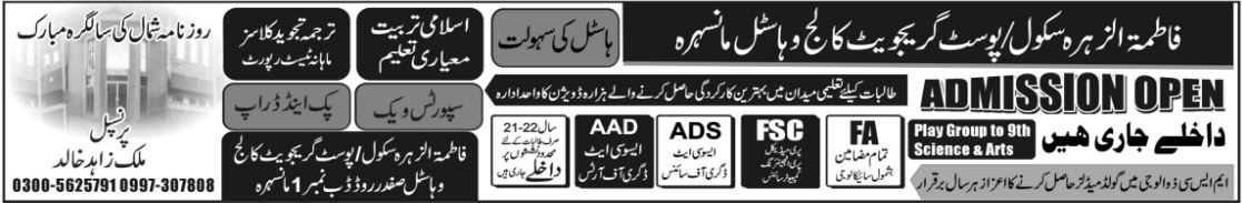 Fatima Tul Zahra School & Postgraduate College Play Group to 9th Class, FA, FSc, ADS, AAD admissions 2023 has been started. Fatima Tul Zahra School & Postgraduate College Mansehra Khyber Pakhtunkhwa KPK Pakistan welcomes students to apply for admissions in academic year 2023 in Science College. Students who want to enroll for academic session 2023 in Intermediate, Primary, ADP, Middle and Matric qualification and admission criteria for Private institute can apply till last date 19 March 2023. Read newspaper ad for exact details.