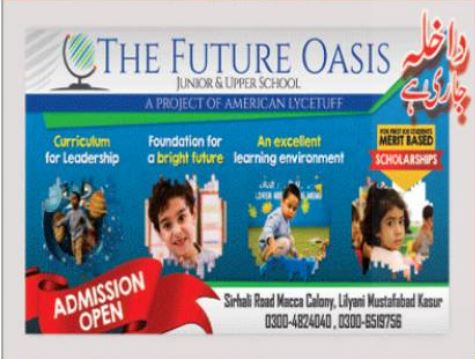 Admissions in The Future Oasis School 2023 for Play Group to Matric Classes has been announced. Students can enroll for admissions in The Future Oasis School Kasur Punjab Pakistan for academic year 2023 to continue campus based or online education in Science School. Students for admissions in Middle, Matric and Primary & criteria can apply as per Private institute admission policy 2023 before closing date March 5, 2023 as per advertisement. Read newspaper ad for exact details.