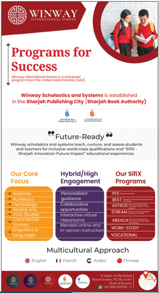Winway International School admissions 2023 for Play Group to Matric Classes has been announced. Eligible students can apply for academic admissions 2023 in Winway International School Karachi Sindh Pakistan for Science School. Students for admissions in Primary, Matric and Middle & criteria can apply as per Private institute admission policy 2023 before closing date July 18, 2023 as per advertisement. Read newspaper ad for exact details.