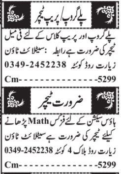 Private School jobs advertisement dated about 10 August 2024 in daily Jang Newspaper invites application for the vacant post of physics teacher, prep class teacher, playgroup teacher, math teacher and teacher in Quetta, quetta Balochistan Pakistan. Candidates with M.sc, Master and Bachelor etc. educational background will be preferred.