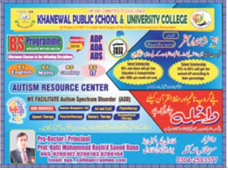 Khanewal Public School & College admissions 2023 for Playgroup to 9th Class, Hifz ul Quran, ADP Program, BS Program has been announced. Students can enroll for admissions in Khanewal Public School & College Khanewal Punjab Pakistan for academic year 2023 to continue campus based or online education in Science College. Eligible students for fulfilling criteria for admissions in Primary, ADP, Matric, BS, Middle and Course can enroll as per Private admission policy 2023 till closing date 13 September 2023. Read newspaper ad for exact details.